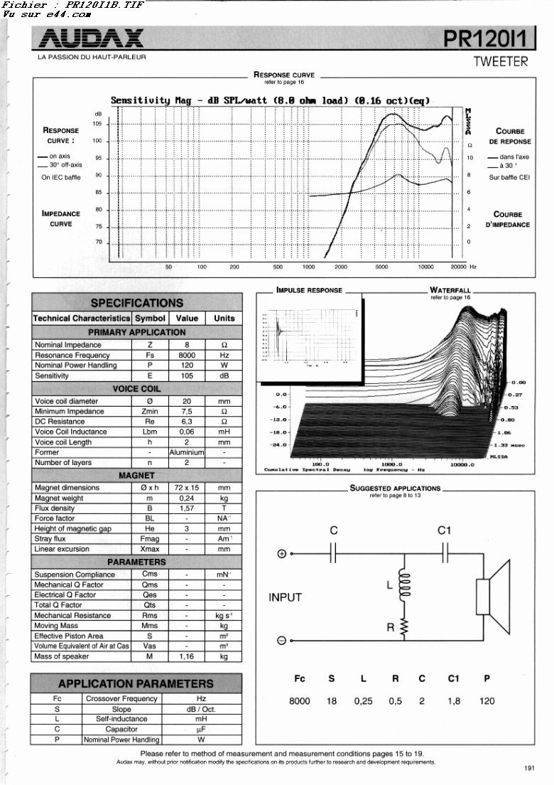 La sensibilité donnée par le constructeur est de 97 dB/W/m ce qui semble un peu optimiste puisque les caractéristiques du HP le moins performant en terme de rendement, le HP de grave, est annoncé à 90 dB/W/m. Comme il y en a 2, nous arrivons à 93 dB, ce qui n'est tout de même pas si mal.