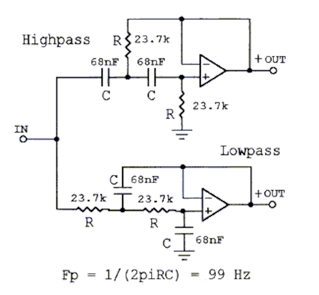 Ils font appel l'un comme l'autre à un étage suiveur (sortie bouclée directement sur l'entrée), mais certains composants sont doublés faisant passer d'un filtre en Linkwitz-Riley au filtre en Butterworth.