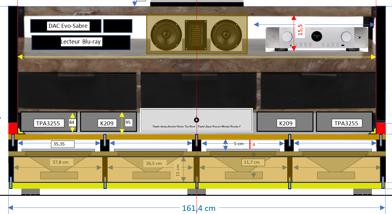 La zone grisée en marron clair laisse apparaitre les 4 haut-parleurs Beyma, mais elle sera bien entendu fermée puiqu'il s'agit des faces arrières des caissons Ripole.Réalisation